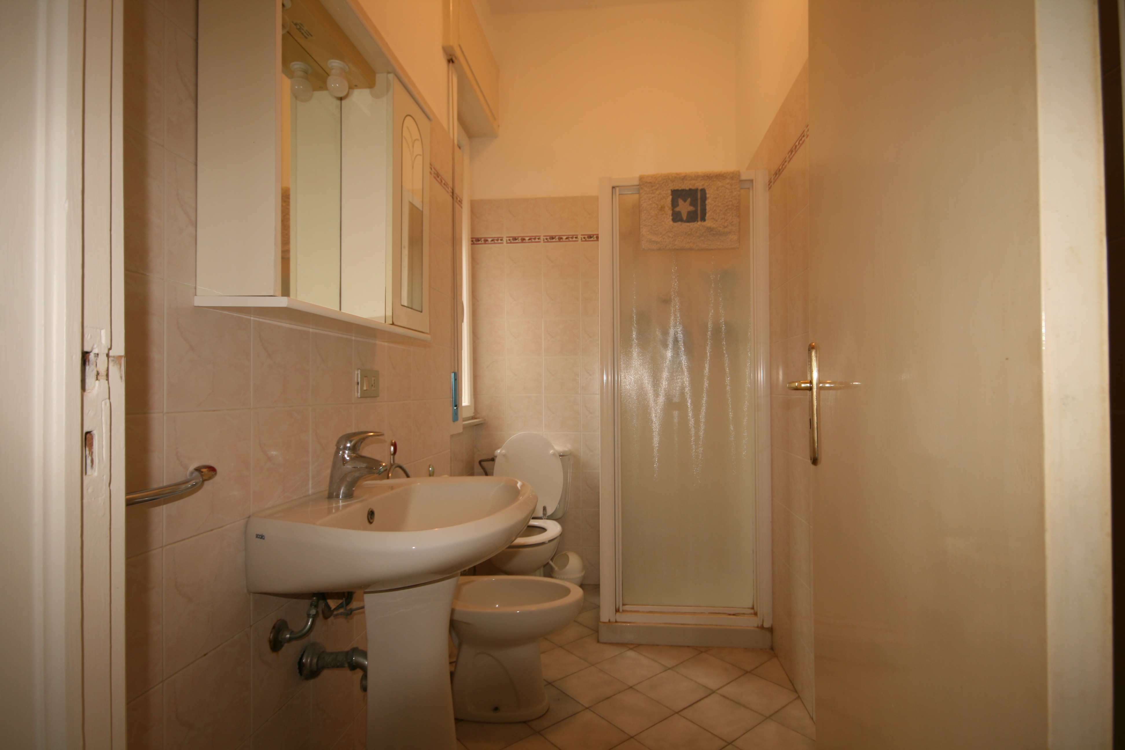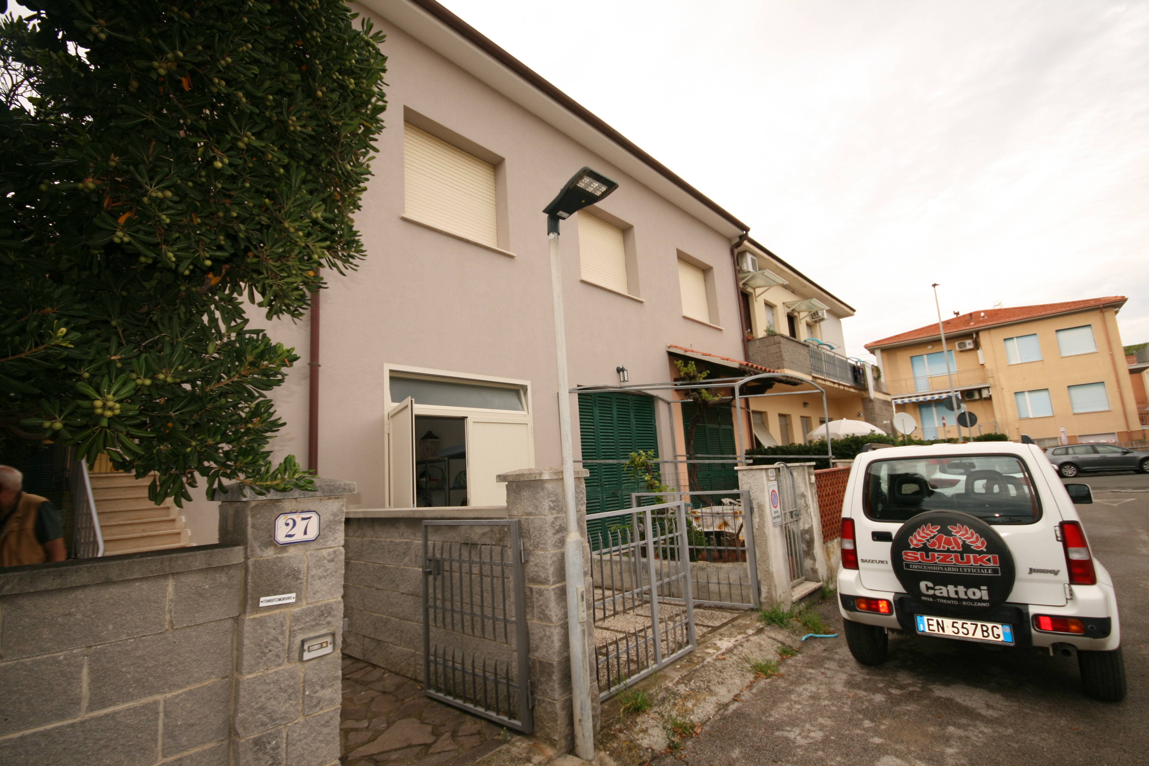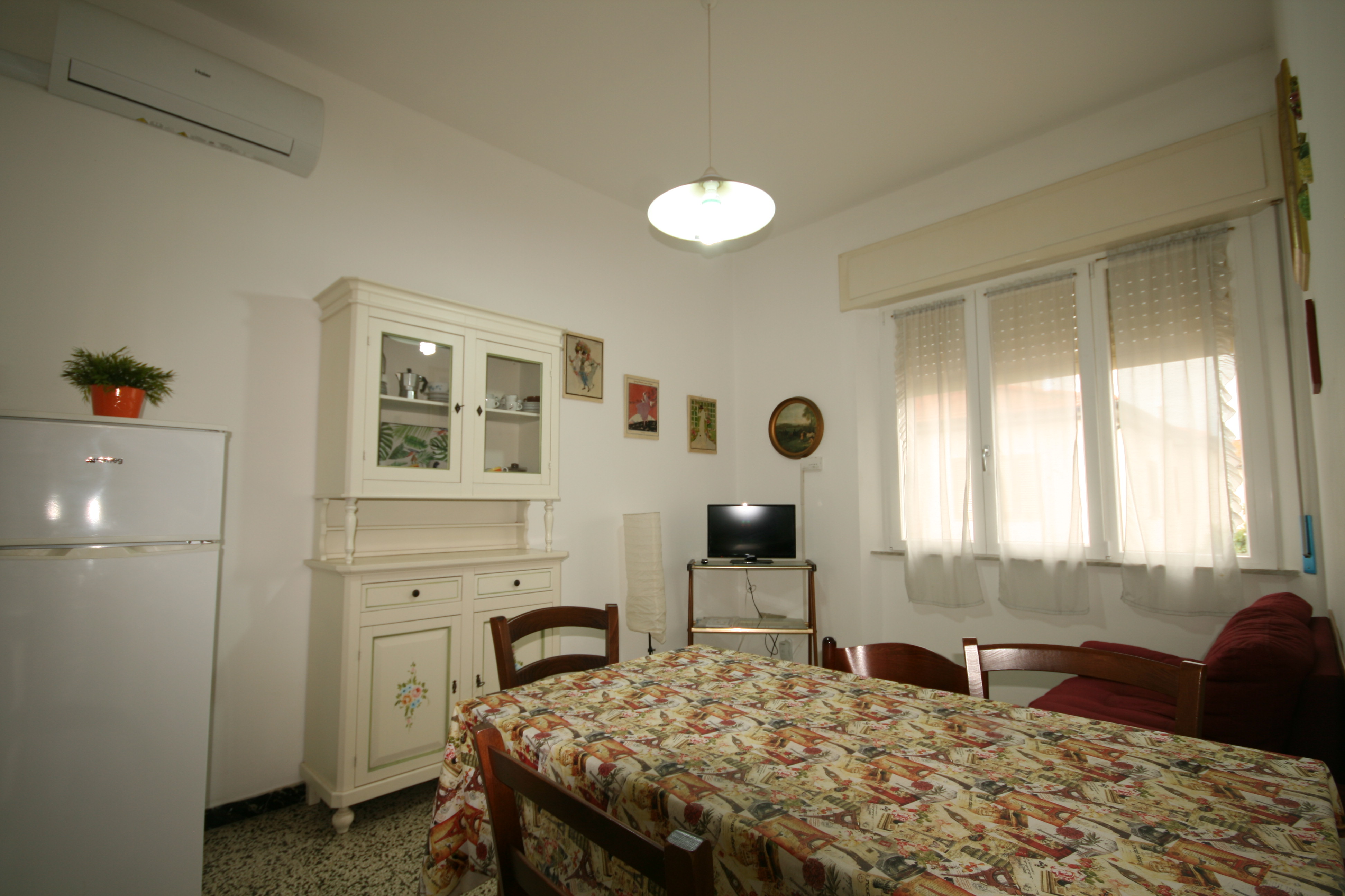 Appartamento con ingresso indipendente a marina di Cecina a una distanza dal mare di circa 400m, offre un cortile recintato privato, e accesso con la scala esterna all'appartamento che si trova al primo piano. L'appartamento cosi composto: soggiorno pranzo con tv, piccolo cucinotto con quattro fornelli a gas e forno, camera matrimoniale con un armadio a ponte, camera matrimoniale con un letto singolo, bagno con doccia e bidet. l appartamento e dotato di aria condizionata e riscaldamento. l'appartamento e ben arredato. Nel cortile privato potete trovare un tavolo con le sedie sotto bellissimi alberi per alternare le vostre cene tra fresco dell'aria condizionata e dell'aria del mare. Nel sotto scala si trova anche la lavatrice. |
